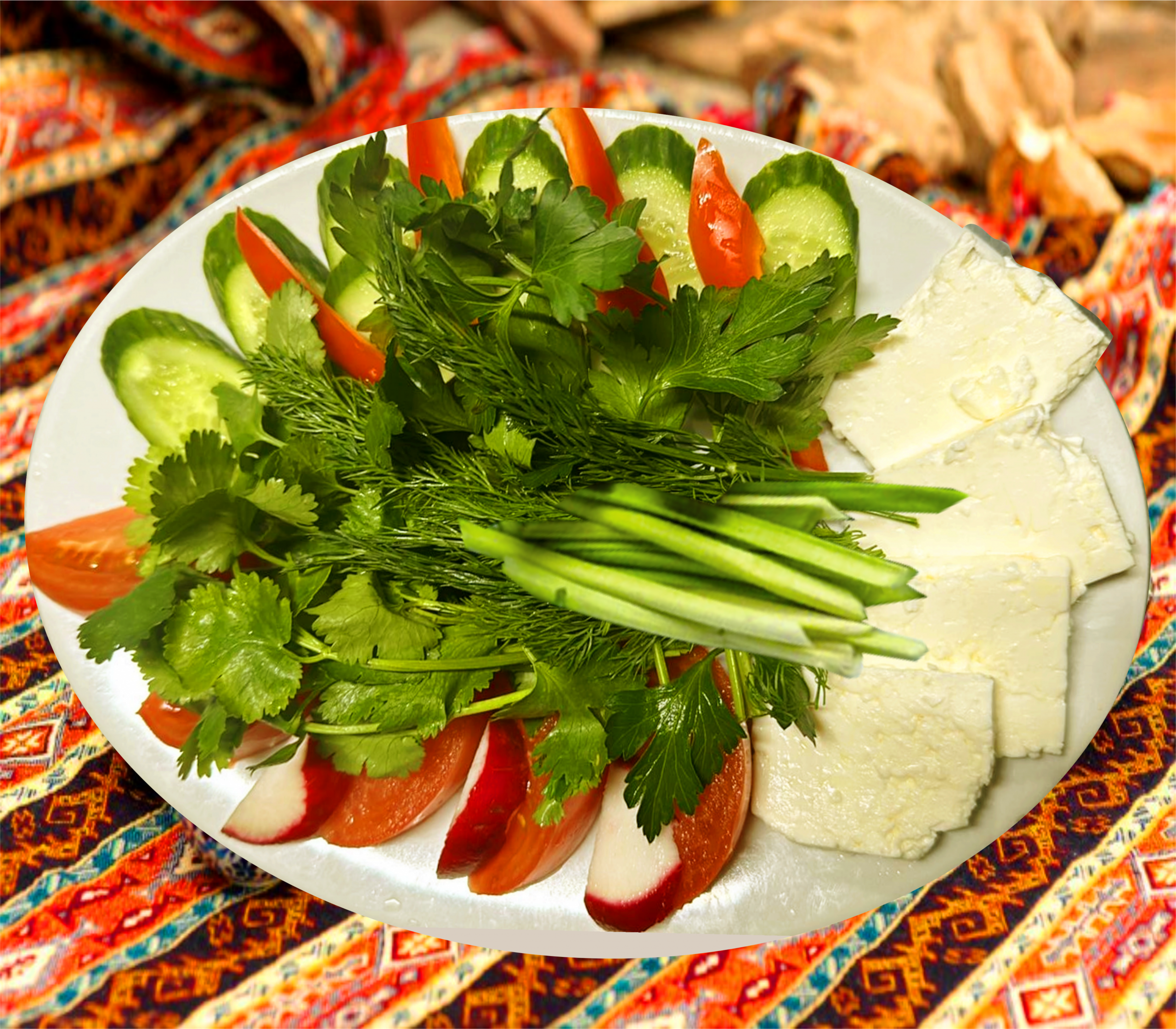 Свежие помидоры, огурцы, ассорти зелени, редис, сыр брынза, зеленый лук
