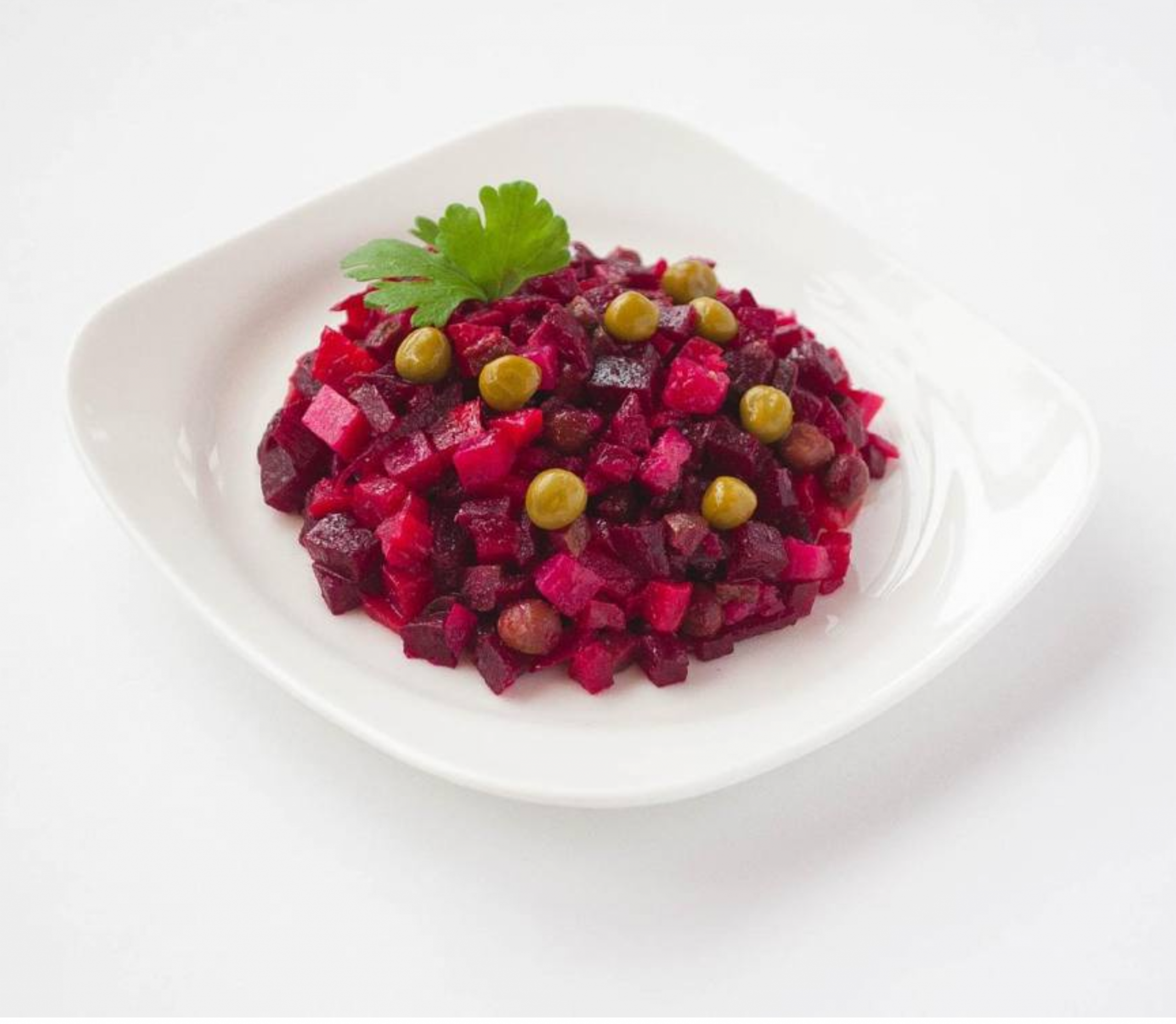 Свекла, горошек, огурец маринованный, картошка, квашеная капуста, оливковое масло, лук